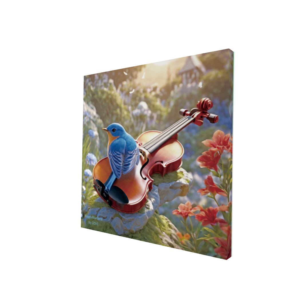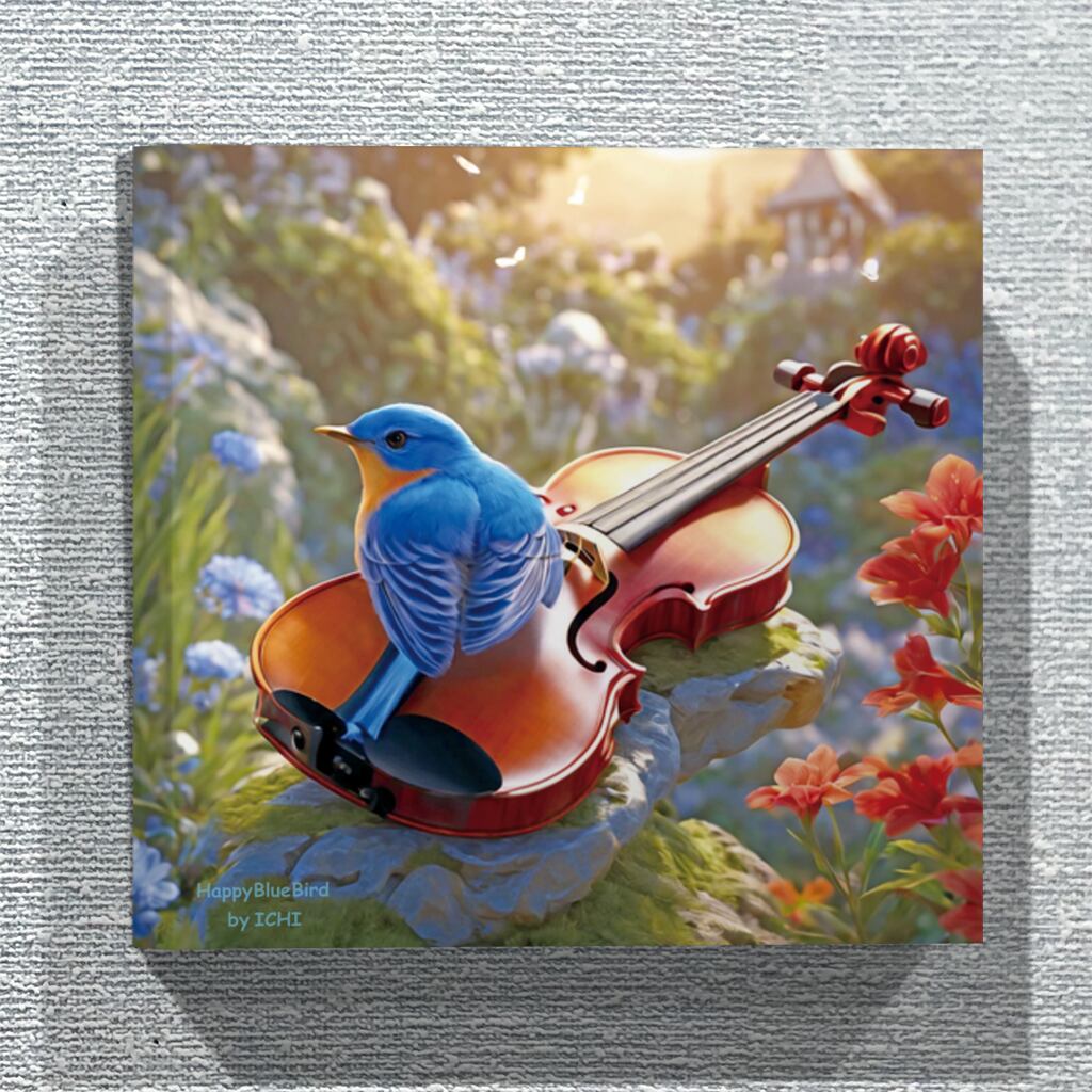 美しいバイオリンの上に乗る幸せの青い鳥、そして鮮やかな花々。