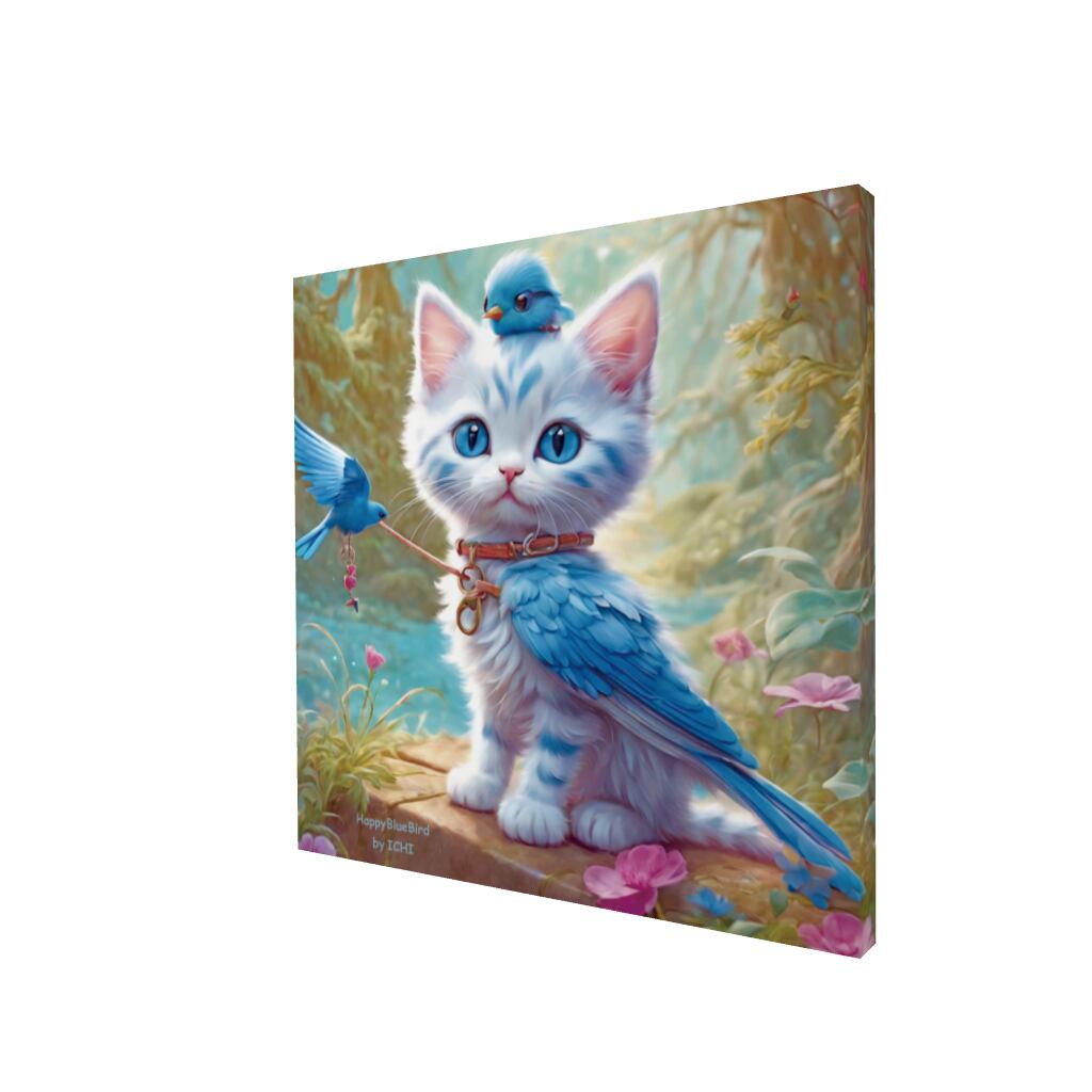 猫と鳥の不思議な共演や、幸せの青い鳥、色鮮やかな花々が描かれ、