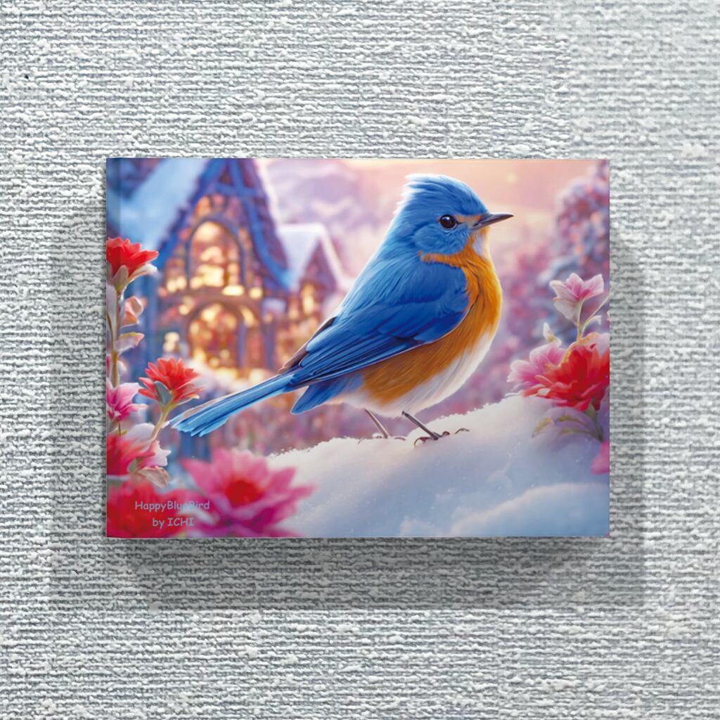 アルプスの美しい風景や幸せの象徴である青い鳥と鮮やかな花々を描いています。